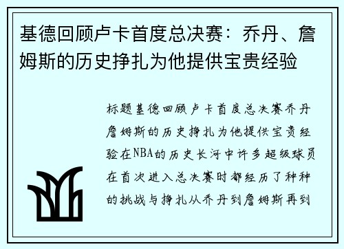 在NBA的历史长河中,许多超级球员在首次进入总决赛时,都经历了种种的挑战与挣扎。从乔丹到詹姆斯,再到现今的卢卡·东契奇,他们的成长道路和总决赛经历,都给后来的球员留下了宝贵的经验。尤其对于像卢卡这样的年轻球员,乔丹和詹姆斯的历史挣扎成为了他在追求总冠军的道路上不可或缺的一部分。作为一位资深球员,基德在回顾卢卡首度总决赛之际,提到了这些历史人物在总决赛中所经历的种种困难与磨砺,也为卢卡未来的表现提供了不少启示。